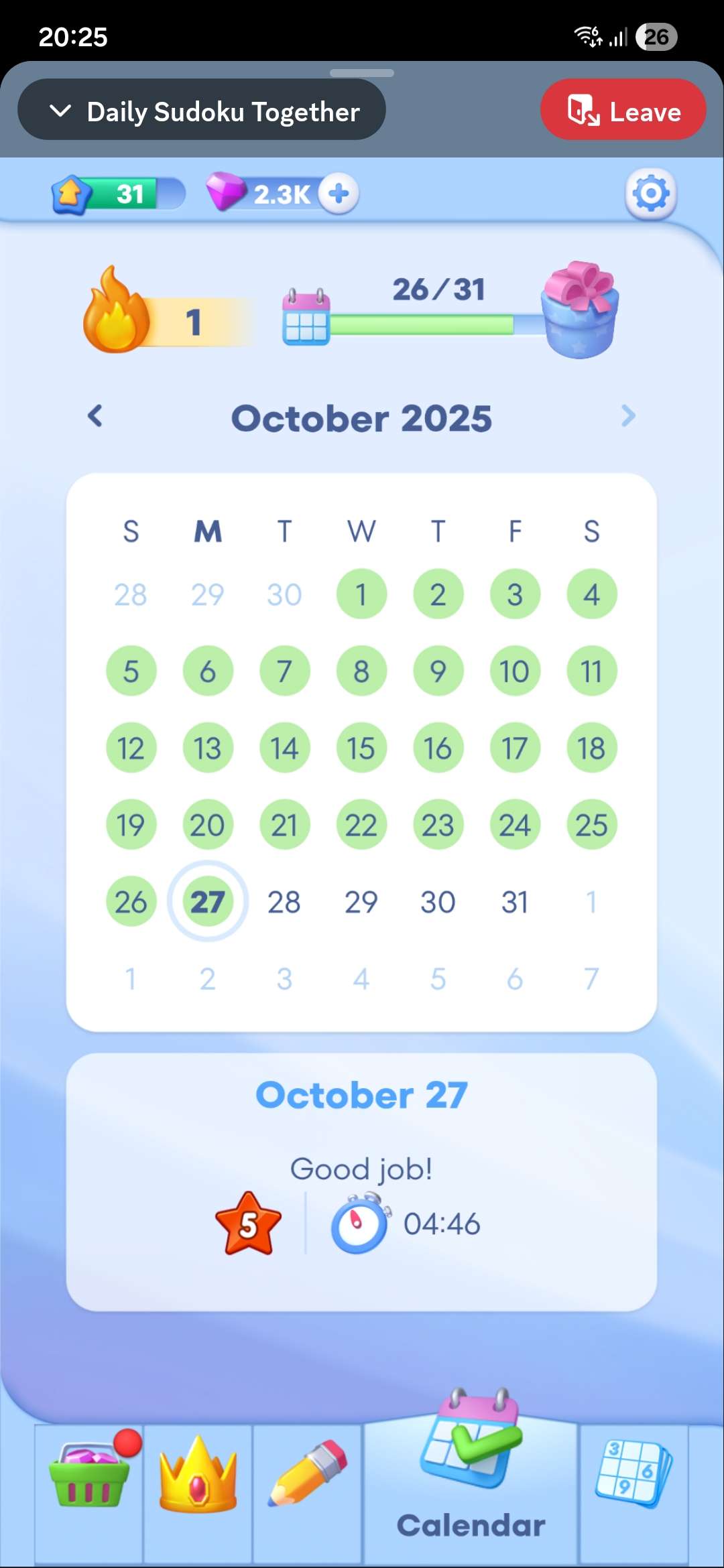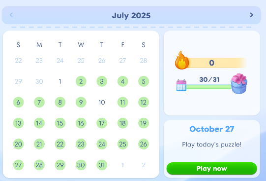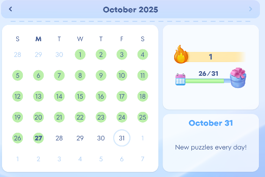 I’m having the same issue. I’m pretty sure I did yesterday’s puzzle (Oct 27). I even launched the game a second time to make sure I had completed it the first time.