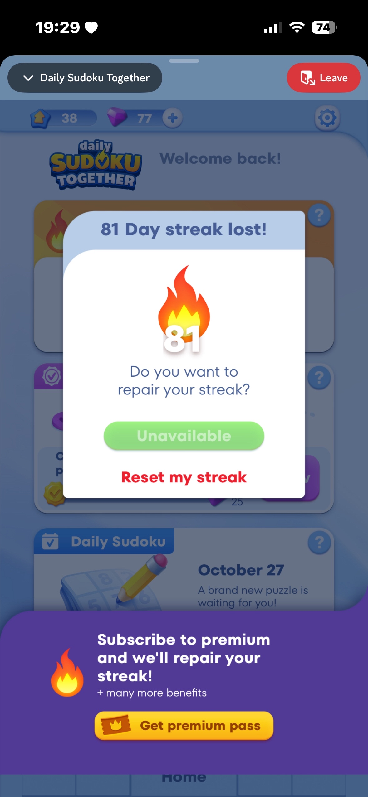 There was a loner loading time before I successfully got in after restarting the app once. I got directly to the main screen without the modal for "break your streak" showing up.