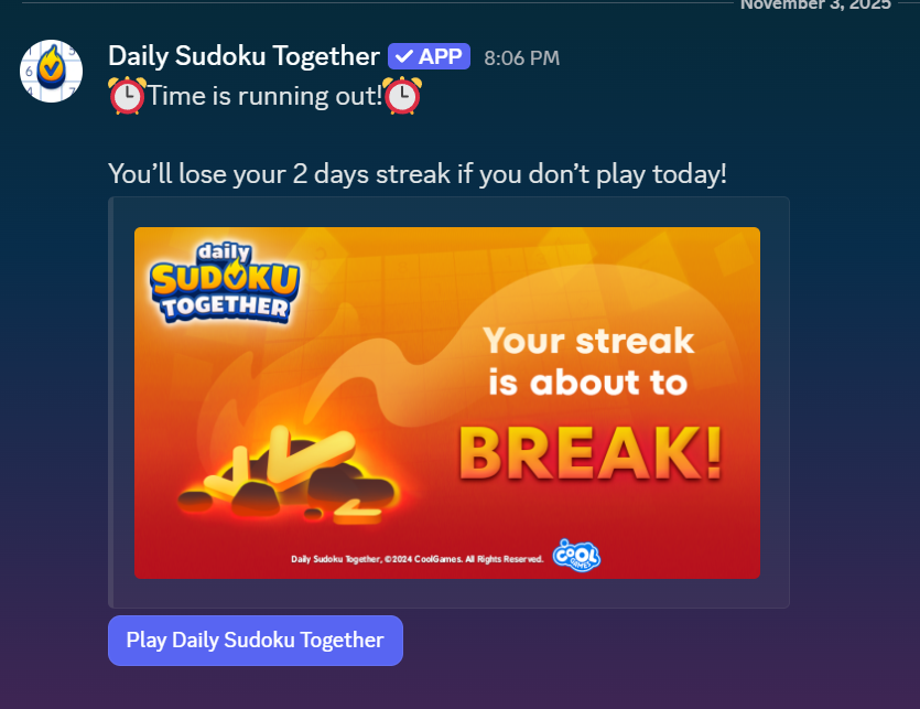 also while we are at it, can the bot stop DMing about the streak warning after ive already done that days daily. i keep getting reminders a few hours after ive already played it
