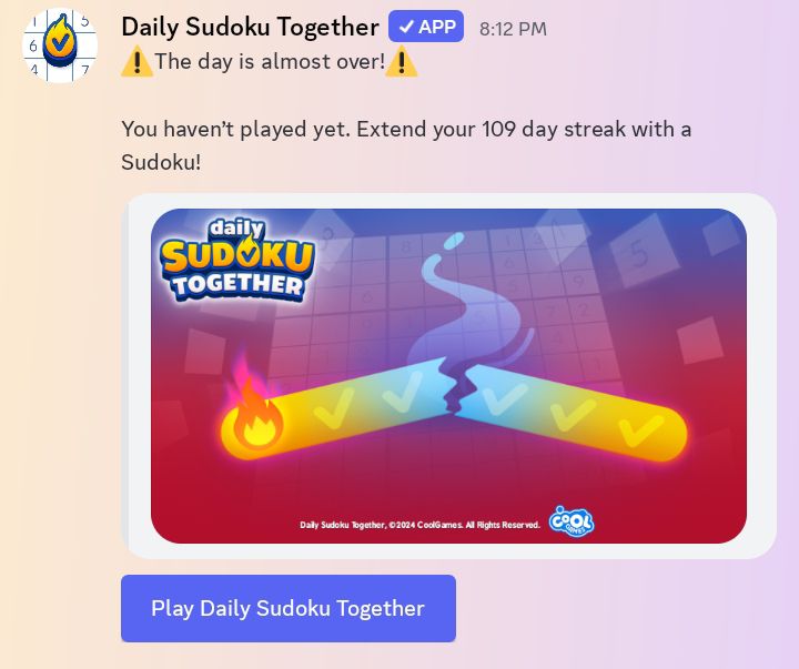 For myself, I only use my PC. Sometimes I launch from the Daily Sudoko icon in my Direct Messages. Sometimes I launch it from the sudoku channel in this server. Can that make any difference?