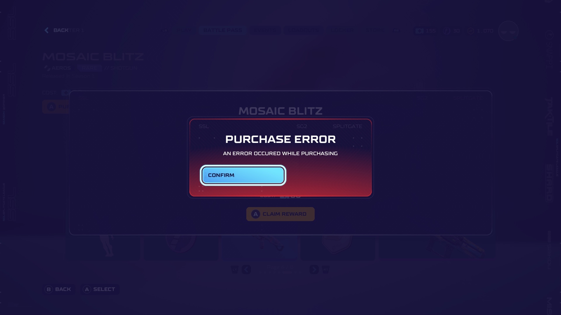 #680 Error according while attempting to purchase the Mosaic Blitz Aeros Shotgun Skin in Battle Pass /