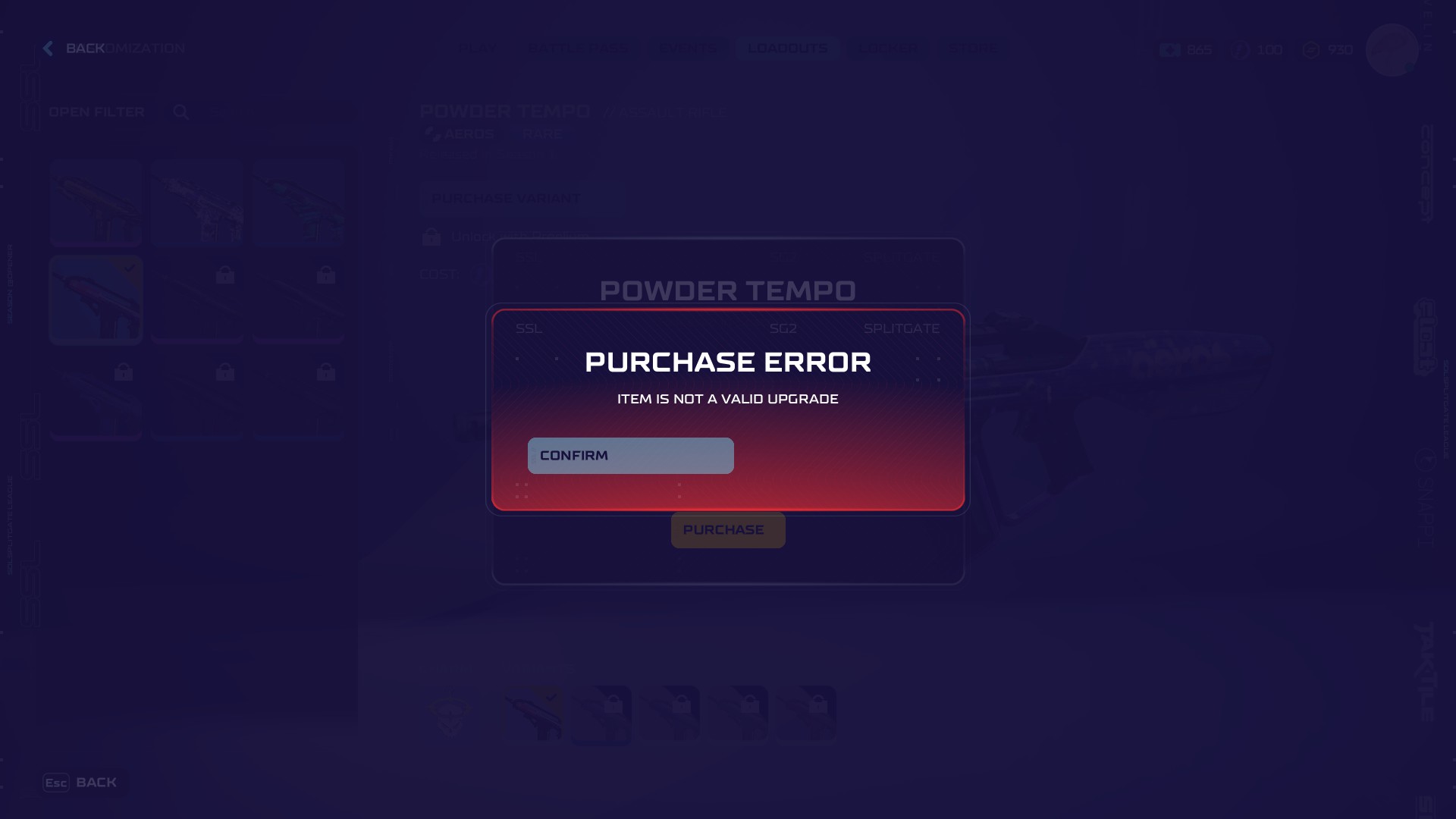 #831 Purchase Error for Powder Tempo Skin in Splitgate 2 /