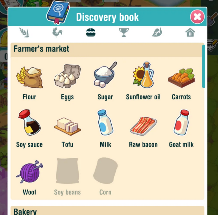 Can you please add some kind of visual indicator showing us which recipes we have unlocked but not yet completed? I just reached level 36 and unlocked the (can of) Corn recipe, but I'm not sure if I've unlocked the Soy Beans recipe yet or not. There's no way to know. I don't typically use the Farmer's Market, and I'd rather wait until I know I have all recipes unlocked before trying to cycle through them and get the gems for completing them.