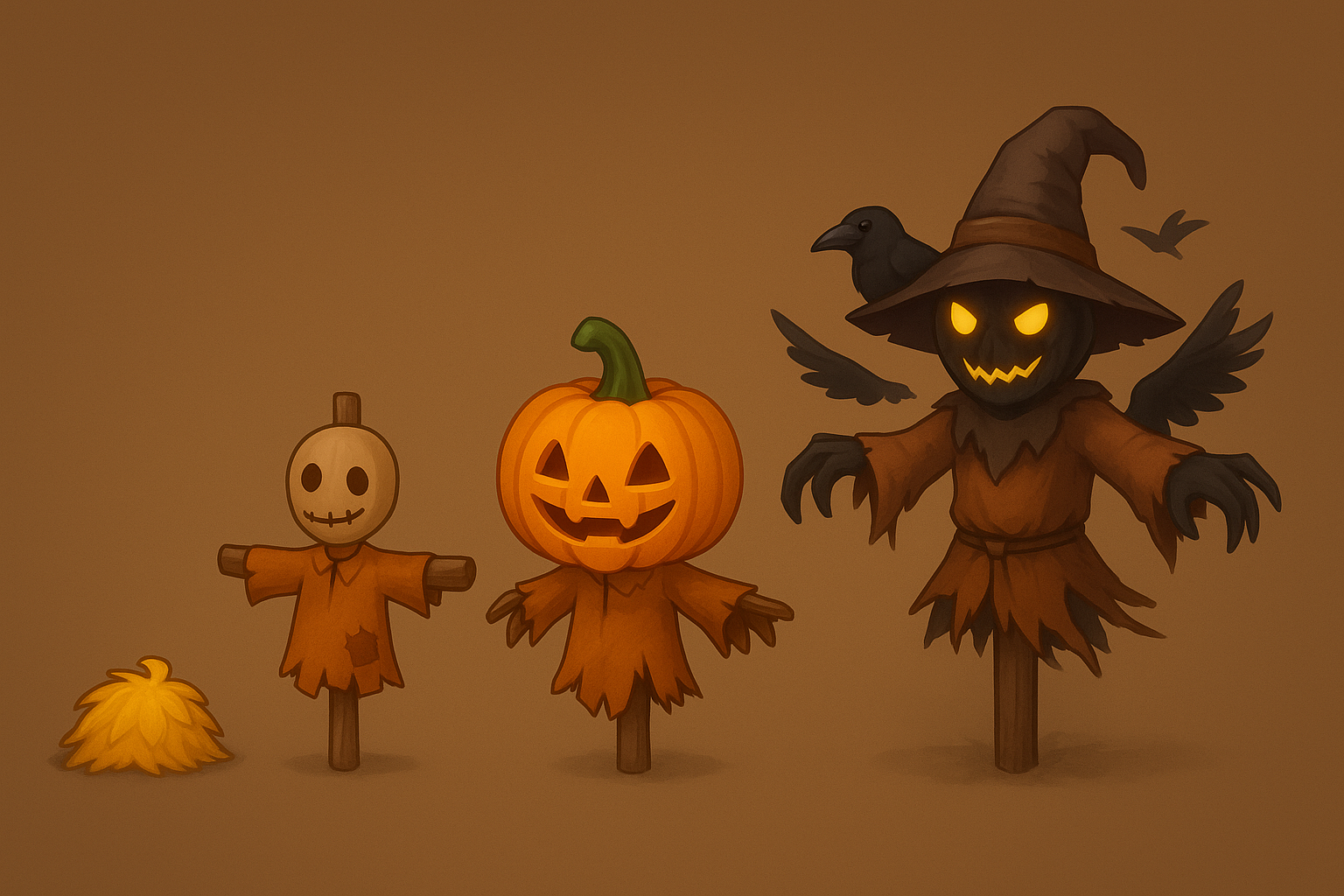 Tier 7: Haunted Scarecrow - Eyes glowing yellow, darker outfit, crows circling around
