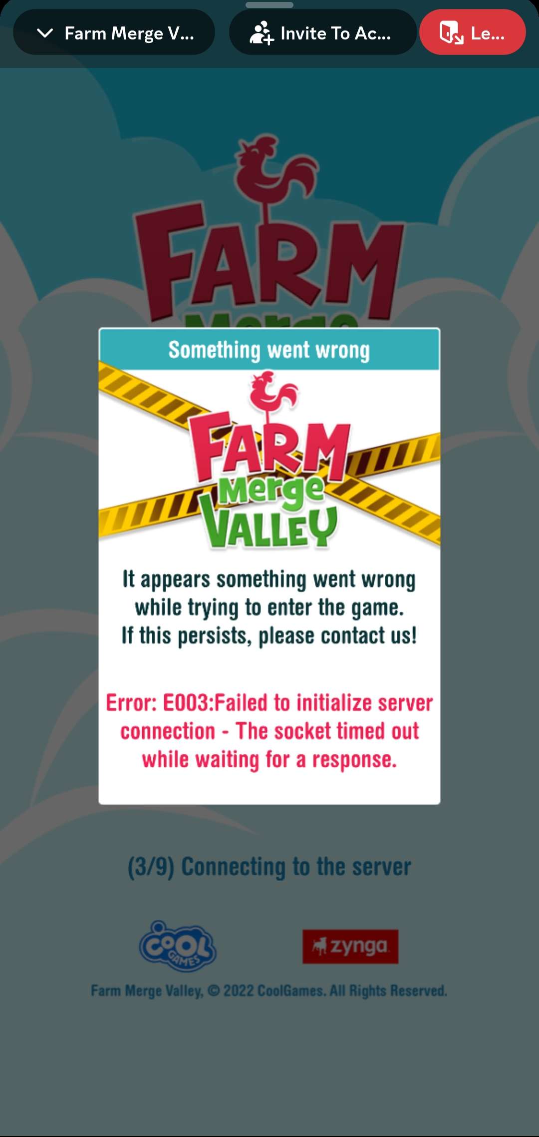 After logging out of the Discord browser, I tried logging in again via the app. I received the E003 code twice before the third attempt left me stuck on 5/9 for 8 minutes and still ongoing.