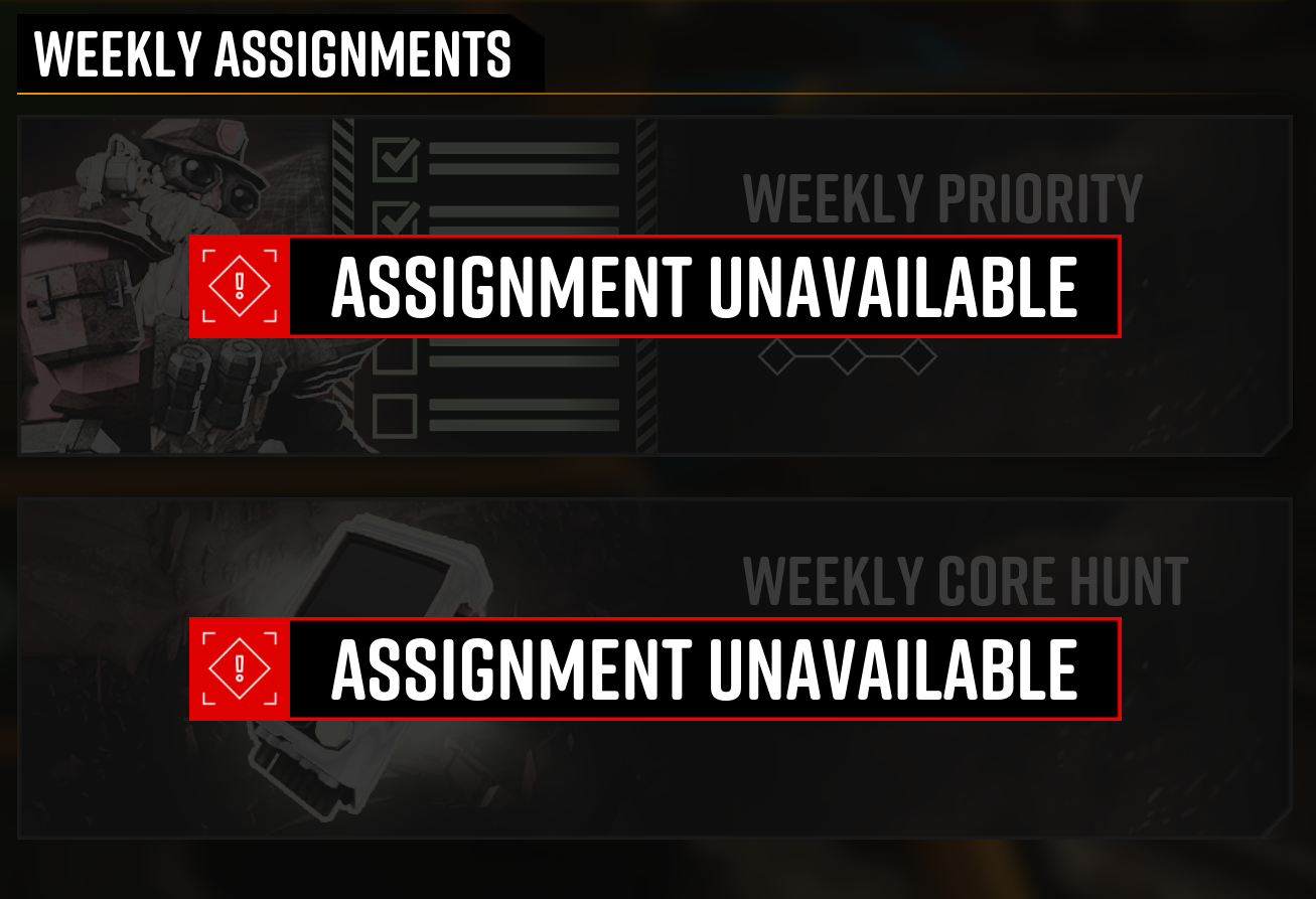 Screenshot shows unobstructed view of Weekly priority assignment and weekly core hunt assignment missions on the mission board, showing them as unavaiable. When hovered over, context is provided that it is usually due to "no internet connection" which isn't the case, or the firewall blocking these features. A firewall exception has been made specifically for this game since day one and was not blocked in the first place. The firewall is not blocking the program in any way, shape, or form