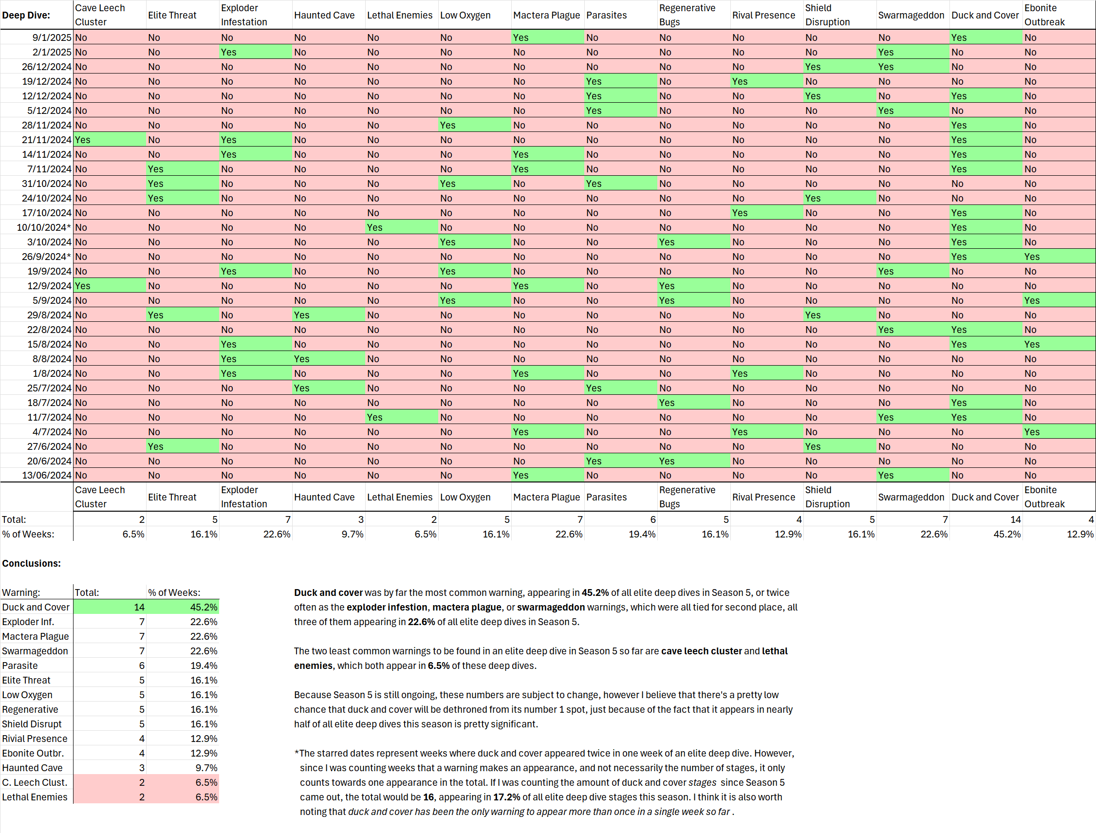 This is a spread sheet created by my significant other cataloguing every warning in an Elite Deep Dive since the start of season 5, and comparing how often they appeared compared to every other warning. It can be seen that Duck and Cover is more than twice as likely to appear in an Elite Deep Dive compared to the 3 most common Warnings, and that Duck and Cover appeared 4 times in a row on two occasions.