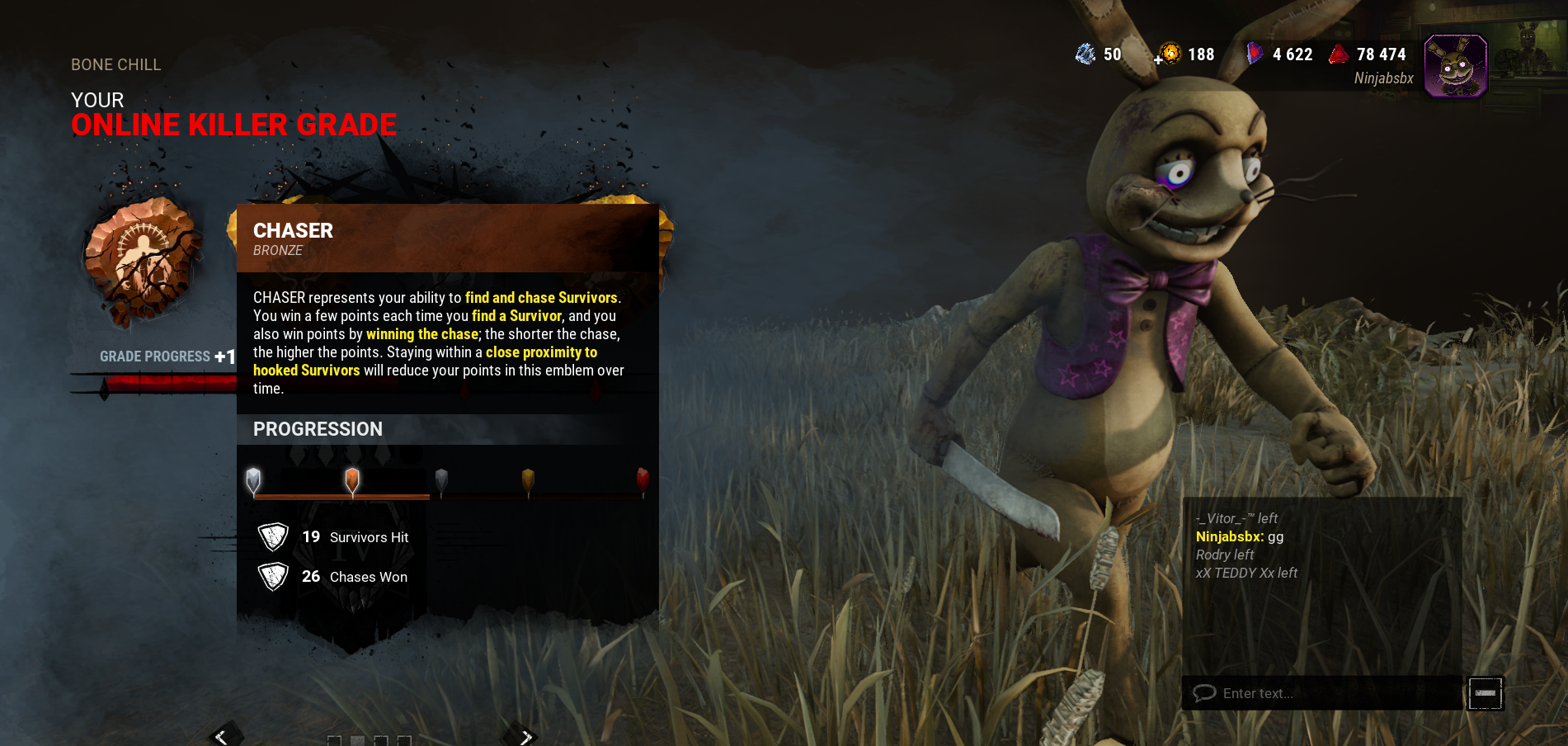 This bug has been in the game since Springtrap's inclusion and is quite often keeping me from playing him. It feels terrible to have a well-rounded, strong game only to find that the Chaser emblem is silver.