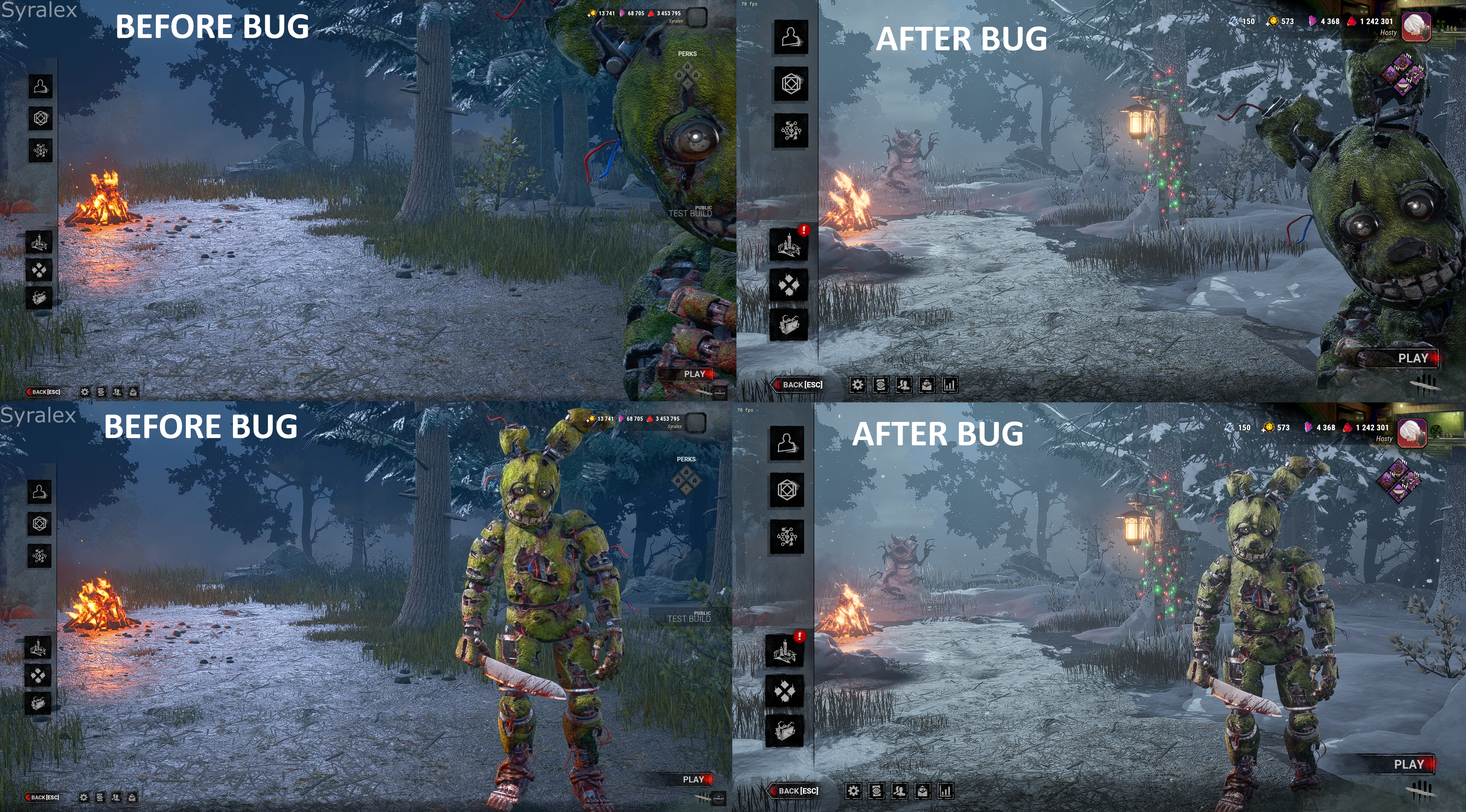 I have attached screenshots that display a comparison of how both his intro animation (the ones at the top) and his idle animation (the ones at the bottom) in the lobby looked before the bug (the ones on the left) and how it looks now with the bug (the ones on the right).