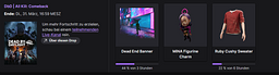 Hello there! So, I've noticed a bug with the current DBD twitch drops. You get the sweater skin (Ruby Cushy Sweater) after one hour of watching streams. According to the drops you should get the MiNA Figurine Charm though. As such I got the sweater instead of the charm. This should be fixed.