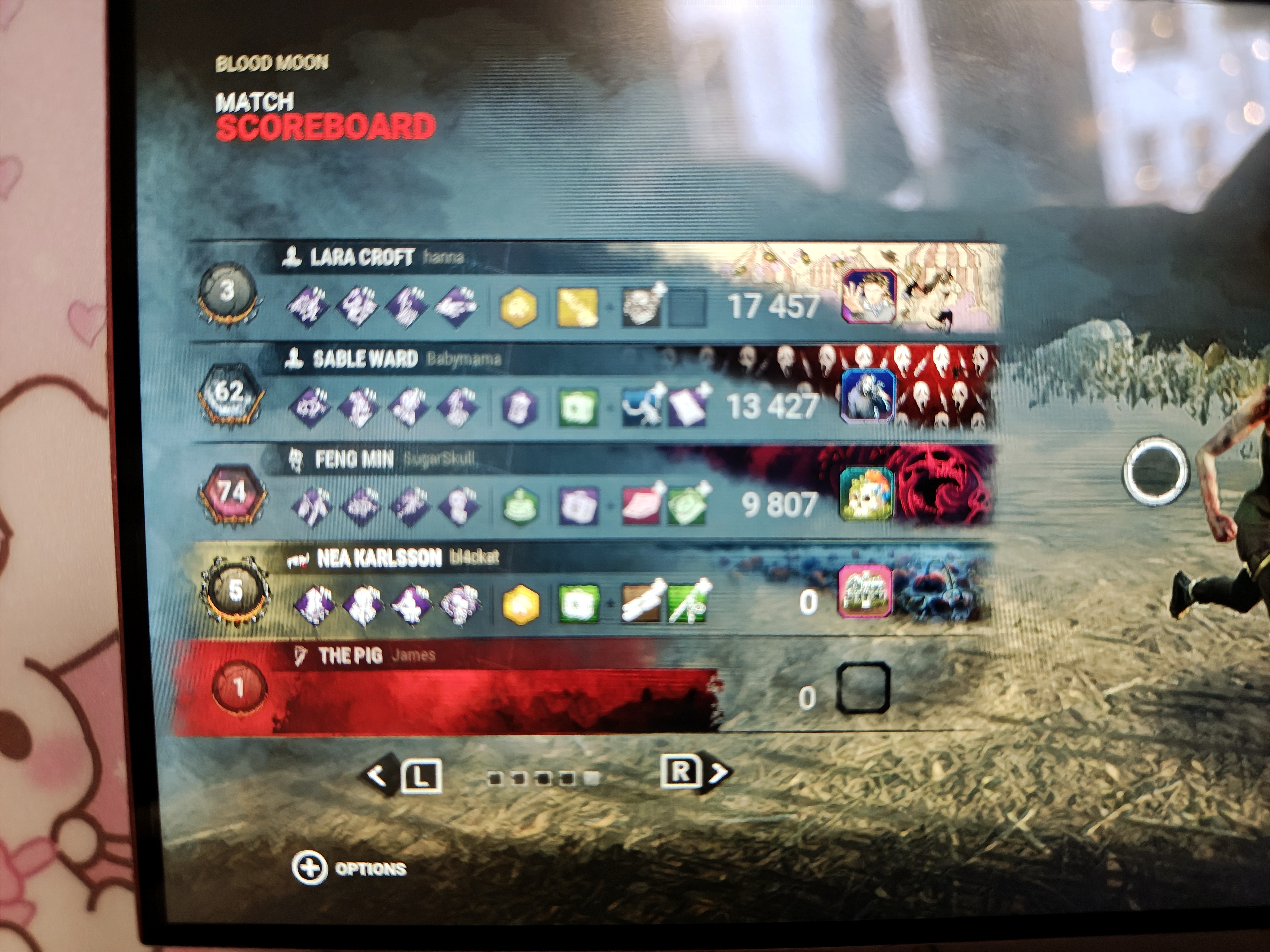 The first three players can be seen with blood points, the fourth player is me with zero, and then the killer at the bottom with zero as well