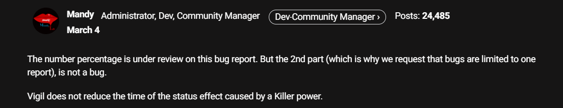 This is Mandy confirming on March 4th that Vigil doesn't reduce the time of the status effect caused by a killer power.