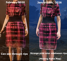 Nancy Wheeler's "Snow Ball Dress" outfit is missing the alpha texture on both the torso and leg pieces, making the rips appear pink instead of being able to see through them. The leg piece used to have very good, flowy physics, and now lacks them, leaving them feeling very strange and unnatural.