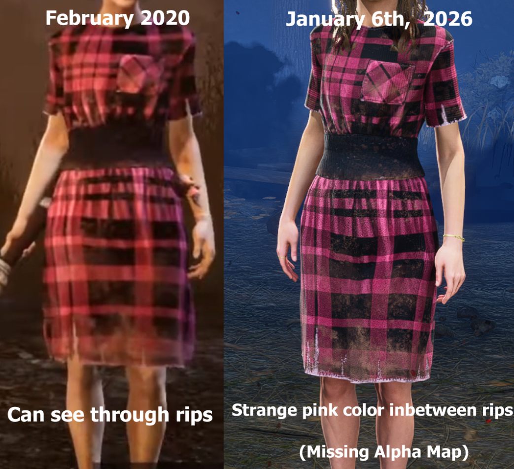 On the left is a picture from an old build of Dead by Daylight from February 2020. You can see through the rips very clearly on her torso and leg pieces. On the right is a picture from the 9.4.0 PTB. You can no longer see these rips and instead there's a strange pink texture in between them, due to a missing alpha map texture.