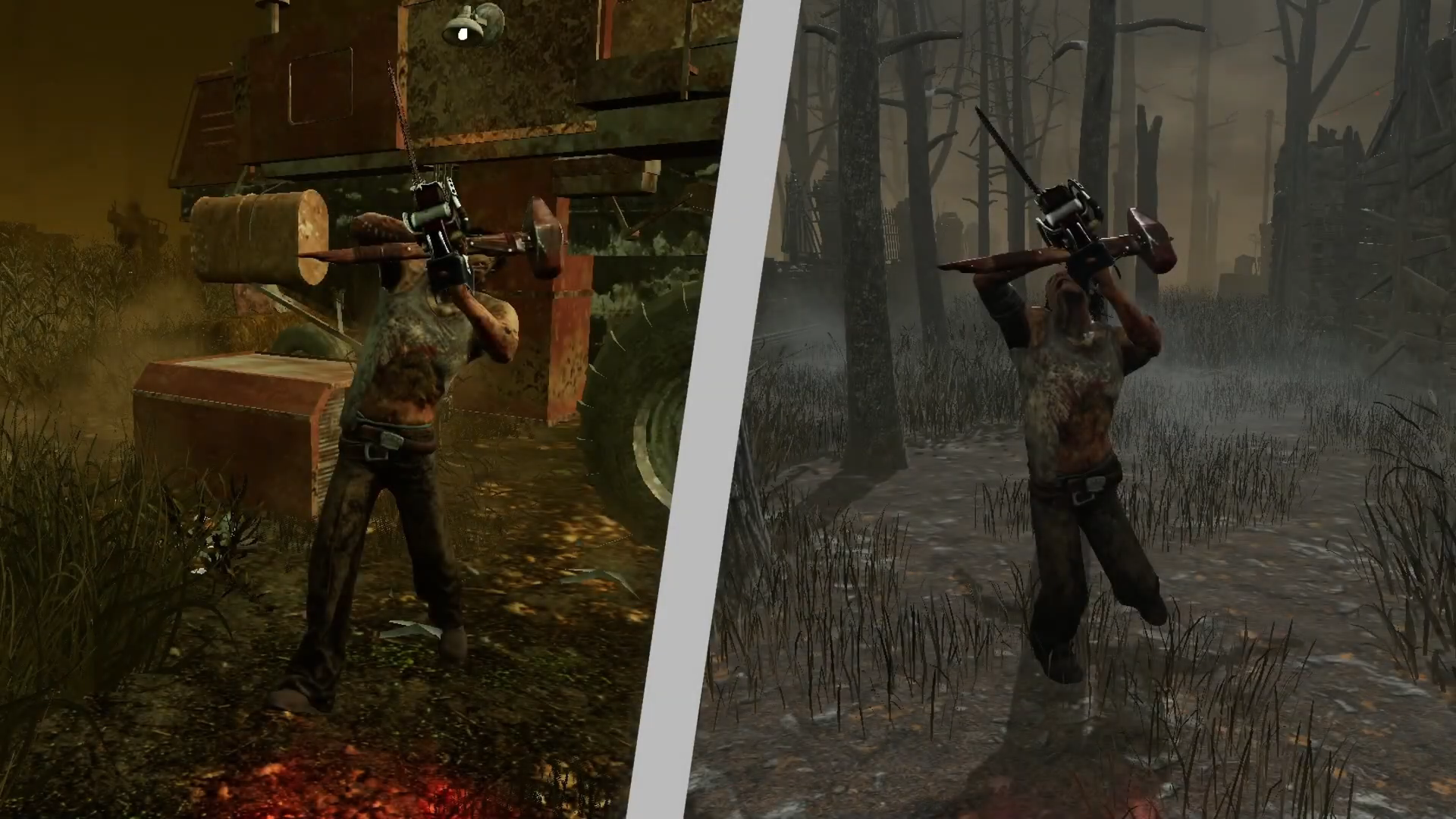 Left is old and right is live. Live version has the chainsaw raised higher above his head and the chainsaw is more sideways.