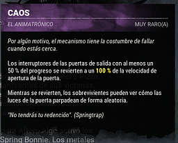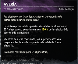 The Animatronic's Haywire perk has a bad description on both Spanish text localizations. This is happening since its little nerf on version 9.0.0.