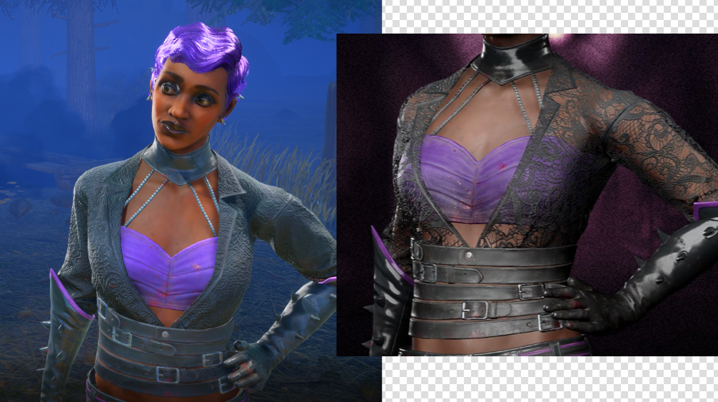 You can clearly see how the one on the right is sheer lace while the one on the left is not but rather plain. The one on the right was taken from an official DBD post showcasing the outfit, so it should look like that in-game.