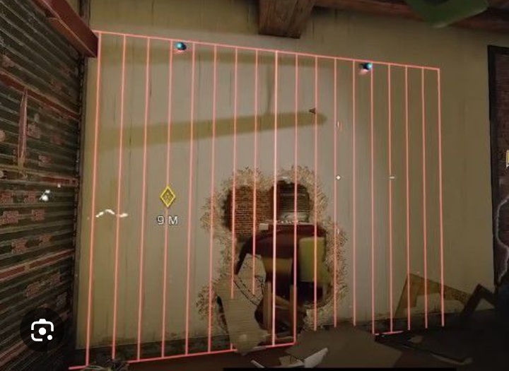 Appearance: if will be a almost invisible gadget until you are 5 feet away where it's easily visible , it would have red ( for attackers ) and blue ( for defenders) when a defender is near it it will deactivate easily noticeable by the color changes in the wall if further away but won't make a very loud noise. It's design would be a crosshatch design but transparent.