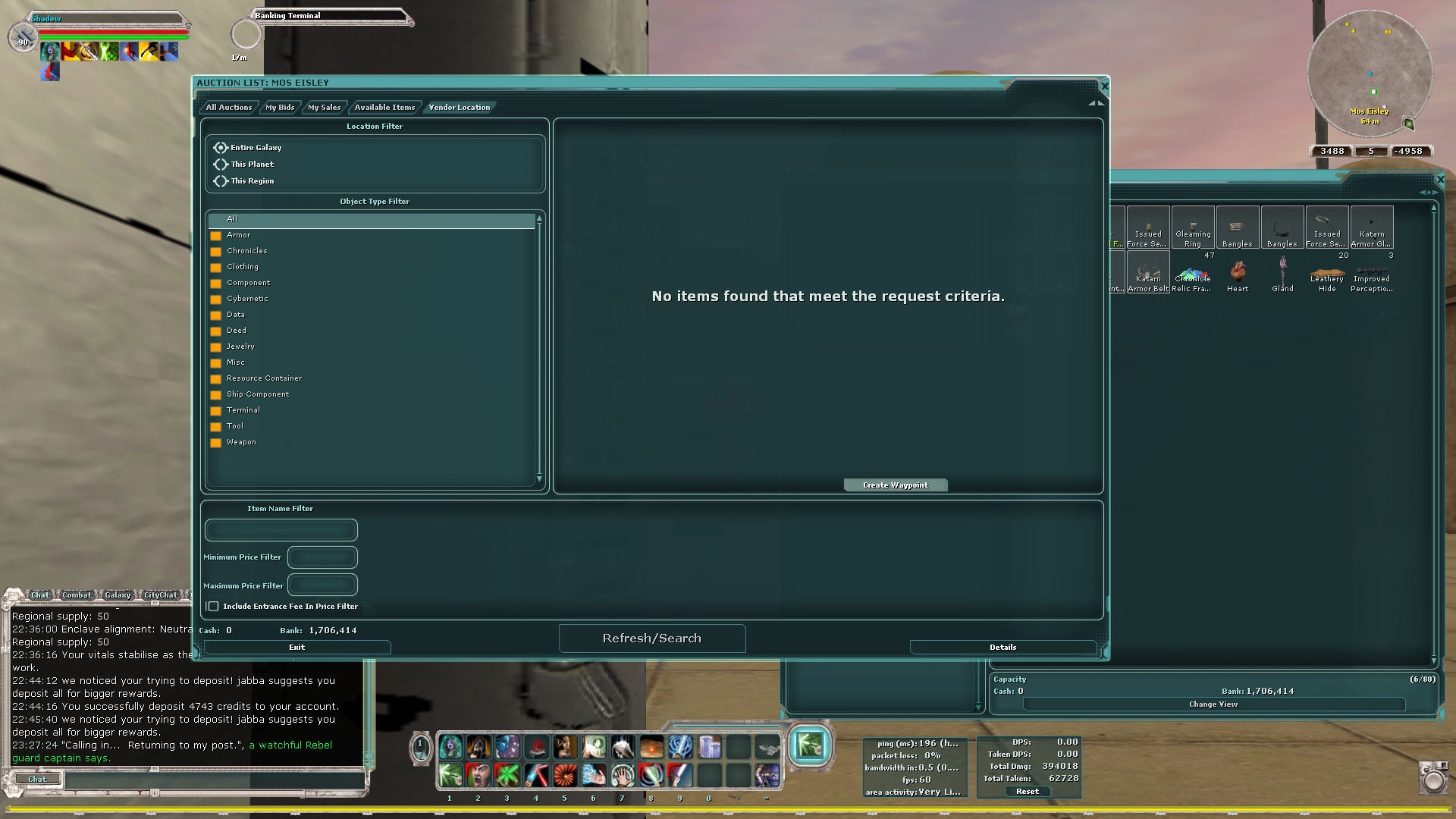 So what it should do is when you follow the steps bellow is list all of the items on various vendors taht are for sale. But it does it shows up empty instead of showing all of the items that are for sale in the galaxy and there are vendors on Naboo that have items up for sale but the Bazzar terminals are not listing all of the items available it lists a few but not everything there are vendors on Naboo and the items are not being listed.