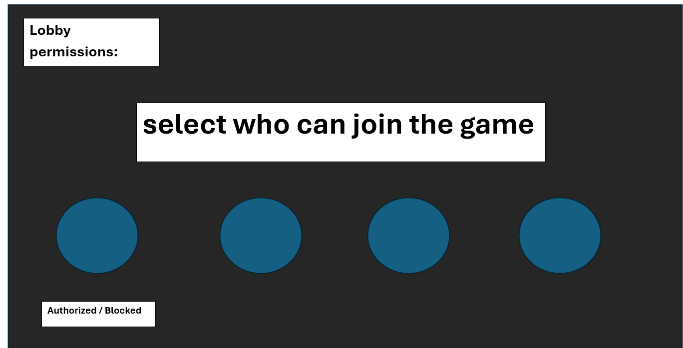 An advanced lobby permissions panel is also accessible from this screen. It allows the host to manually control who can join the session. Each player occupies a visual slot showing their status (pending, authorized, or blocked). When someone attempts to join, they appear as pending, and the host can quickly approve or deny access. This provides direct control without adding unnecessary complexity.