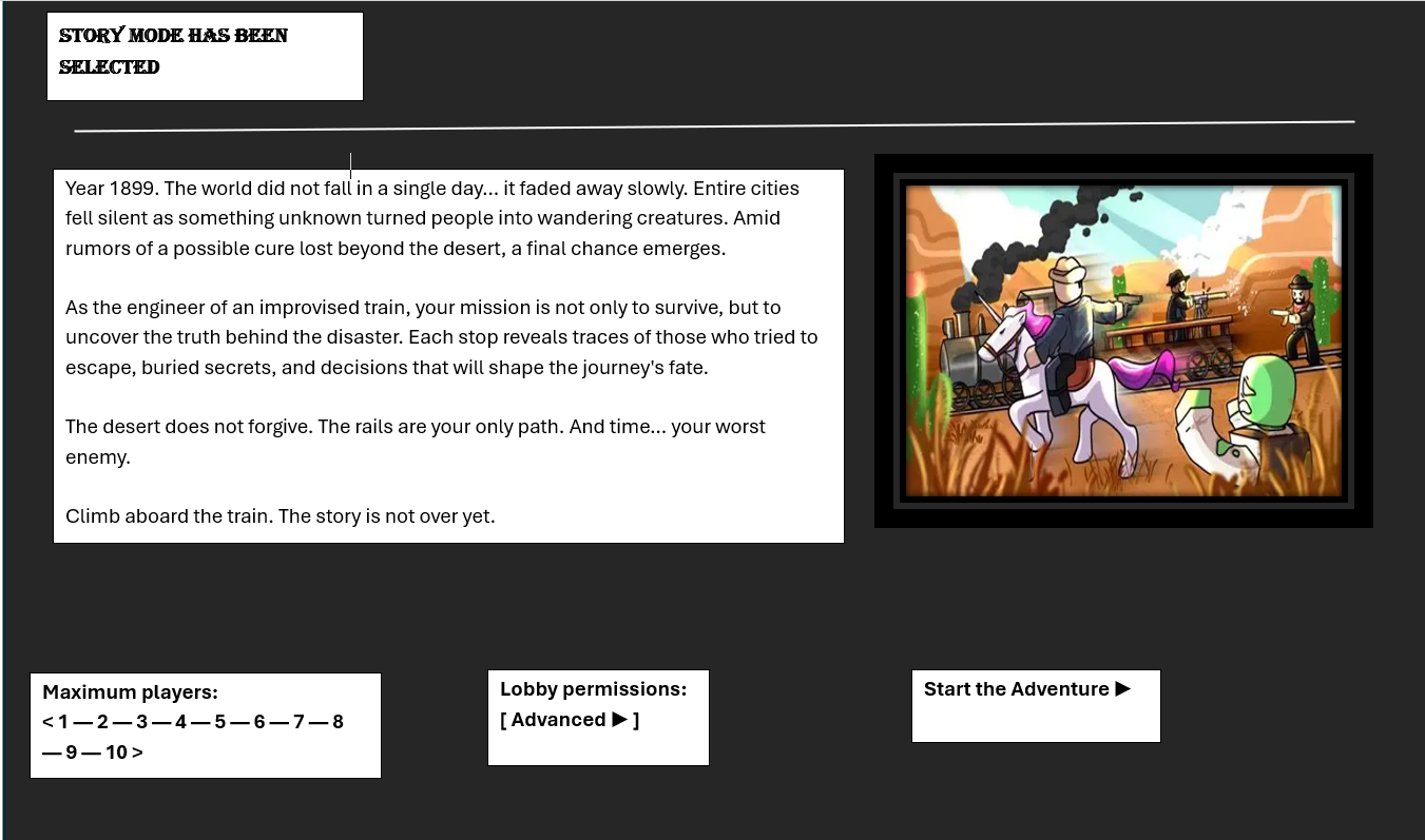 After selecting Story Mode, the player moves to a confirmation and setup screen. This section combines narrative context with essential lobby settings. A short story text introduces the journey to reinforce immersion, supported by a thematic image that visually distinguishes the mode. On the same screen, the host can define the maximum number of players (1–10), establishing clear session limits and preventing confusion when players join.