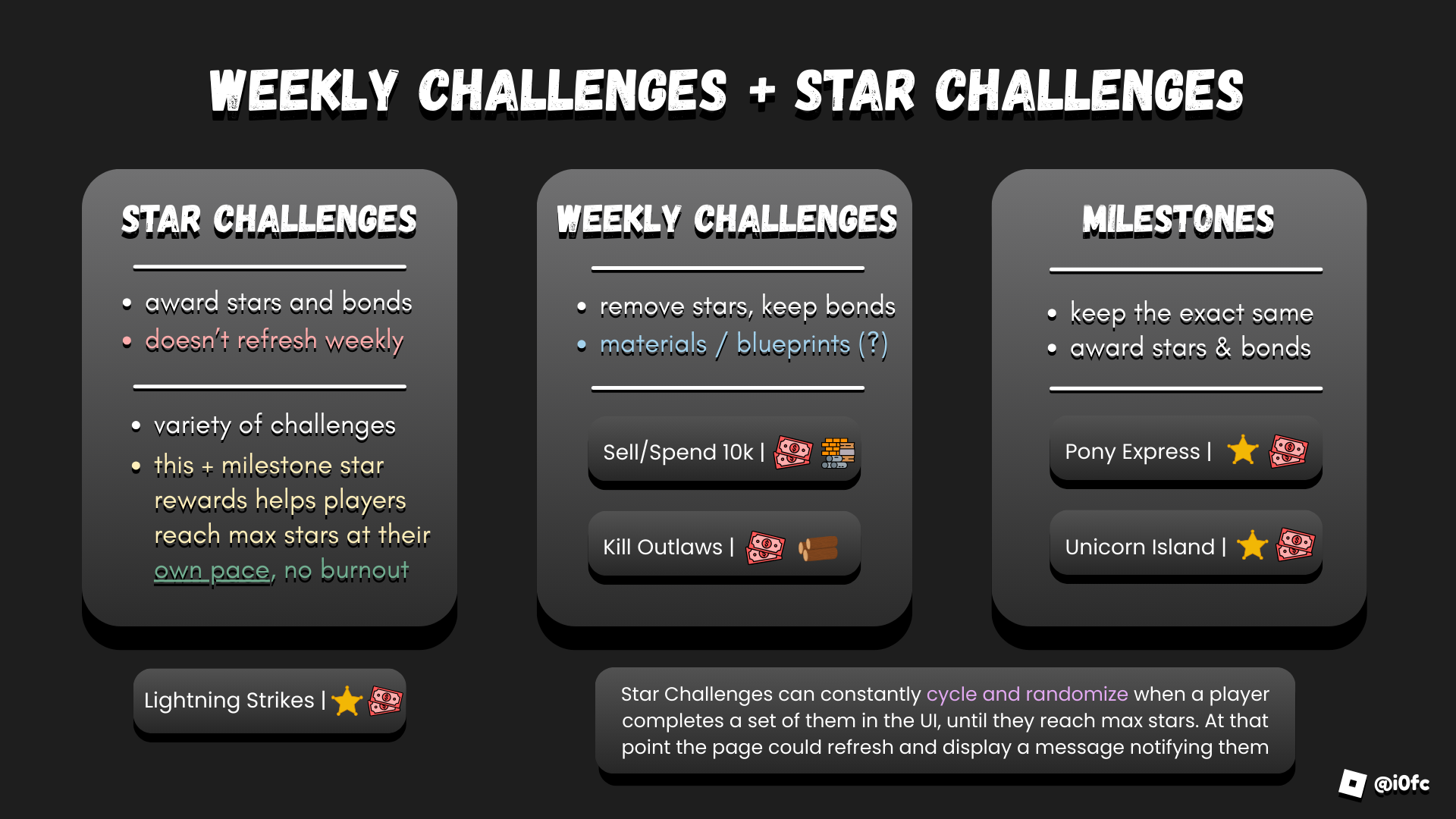 Milestone challenges would remain the same, and they would also reward players with stars and bonds. You can also just combine both Star Challenges and Milestone Challenges into one category if they both reward you with the same thing.