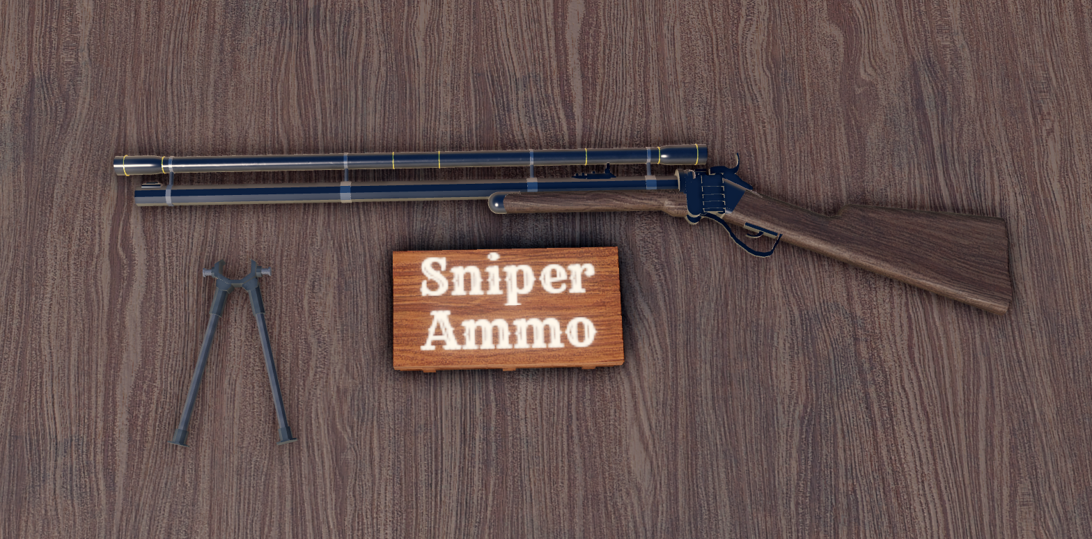 Based on sharps model 1874, it is an very high-presicion hunting rifle used in america during 1899, this gun appears as rare loot inside sheriff houses or outlaws camps, uses an new type ammo, has an telescopic sight, when you shoot it makes an noise too loud and you can attach a support for more accurate shooting