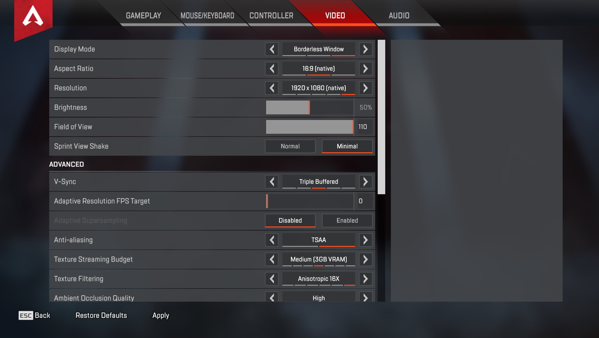 And so on. Each of these options could include different levels with the lowest being Disabled and the highest being Very-High. The file attached is an example from Apex Legends.