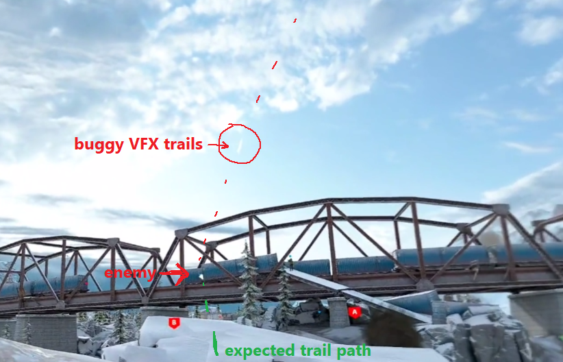 the Bullet VFX (circled red, hard to see) does not lign up with the actual target of the enemy. The green path would be the expected path of the bullet trails.