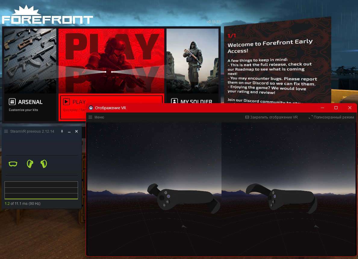 Tested game version v0.16.38 with SteamVR v2.12.14, v2.13.7 and beta v2.14.2. Both game files verified but still the same issue, pretty sure something is wrong between Forefront and SteamVR, as every time the game finishes initial startup, the game icon will disappear from the SteamVR toolbar, but the game is still running on the monitor in Desktop mode.