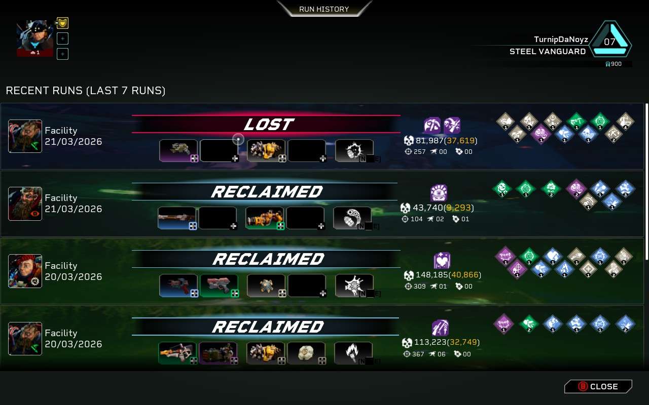The run history menu directly after the bug happened. Note that the latest run is marked as a loss despite the end-of-run victory sequence playing out normally.