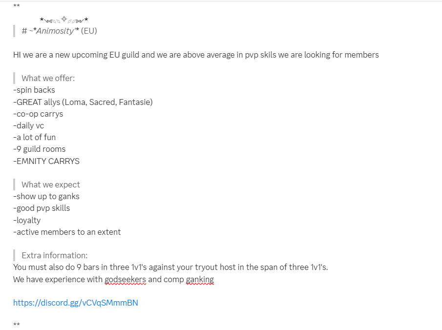 > What we offer: -spin backs -GREAT allys (Loma, Sacred, Fantasie) -co-op carrys -daily vc -a lot of fun -9 guild rooms -EMNITY CARRYS