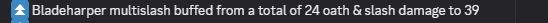 Basically , the mentioned bladeharper buff was indeed implemented but now 1 slash is missing , which makes bladeharper dmg worse/back to where it started Clip: https://medal.tv/games/roblox/clips/lwCuIwItsAI_L0Pvr?invite=cr-MSxkbk8sMTcyNjQwMjU0
